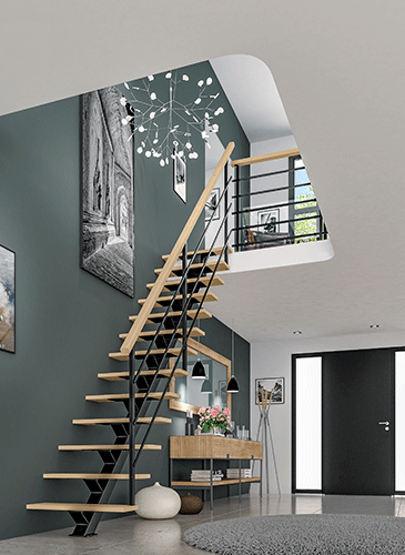 ACCORD est un escalier standard mixant le bois et l’acier. Design contemporain avec son limon poutre centrale, il plaira au plus grand nombre.
