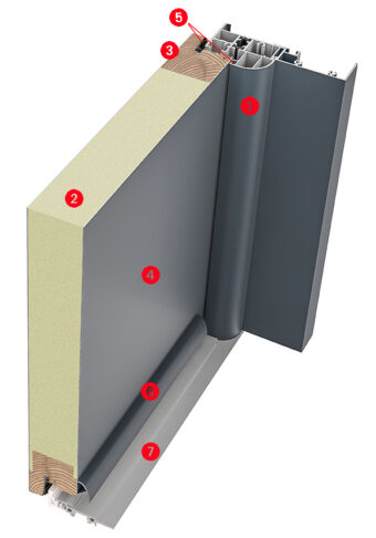 1. Cadre dormant aluminium de 58 mm d’épaisseur ave rupture de pont thermique par barrettes en polyamide. Possibilité de parachever des fourrures pour une isolation totale de 200 mm.